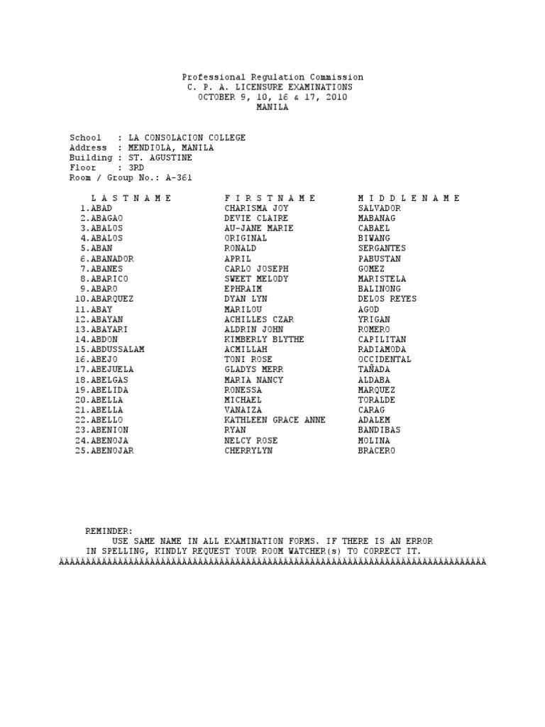 October 2010 Certified Public Account Cpa Licensure Examination Room Assignment Pdf Government Agencies Separation Of Powers