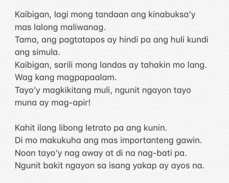 Nagkita rin ang ating landas wala ng iba. Sa saliw ng iyong tinig. Tinanggap ang bawat hamon ng mundo Lumaban Nakipaglaro ng apoy at Patintero kay kamatayan Bitbit ko ay panlangin paglabas ng pinto Nakakapunit man ang hanging sasalubungin Ay yayakapin ko.